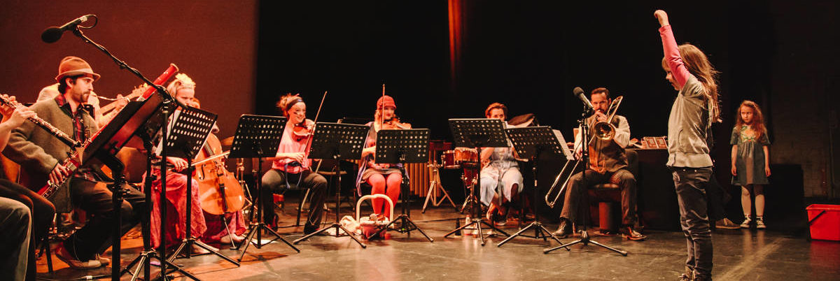 Studio Dan ist eine Band. Aber Studio Dan ist nicht einfach irgendeine Band. Studio Dan ist eine Riesenband! Mindestens 16 Instrumente sind da zu sehen und zu hören. Manche Musikerinnen oder Musiker spielen sogar zwei oder mehrere Instrumente. Da wird die Bühne ganz schön voll. Schlagzeug, Bass, Klavier, Posaune und Trompete, Cello und Plattenspieler, Marimba und Oboe und allerhand anderes.